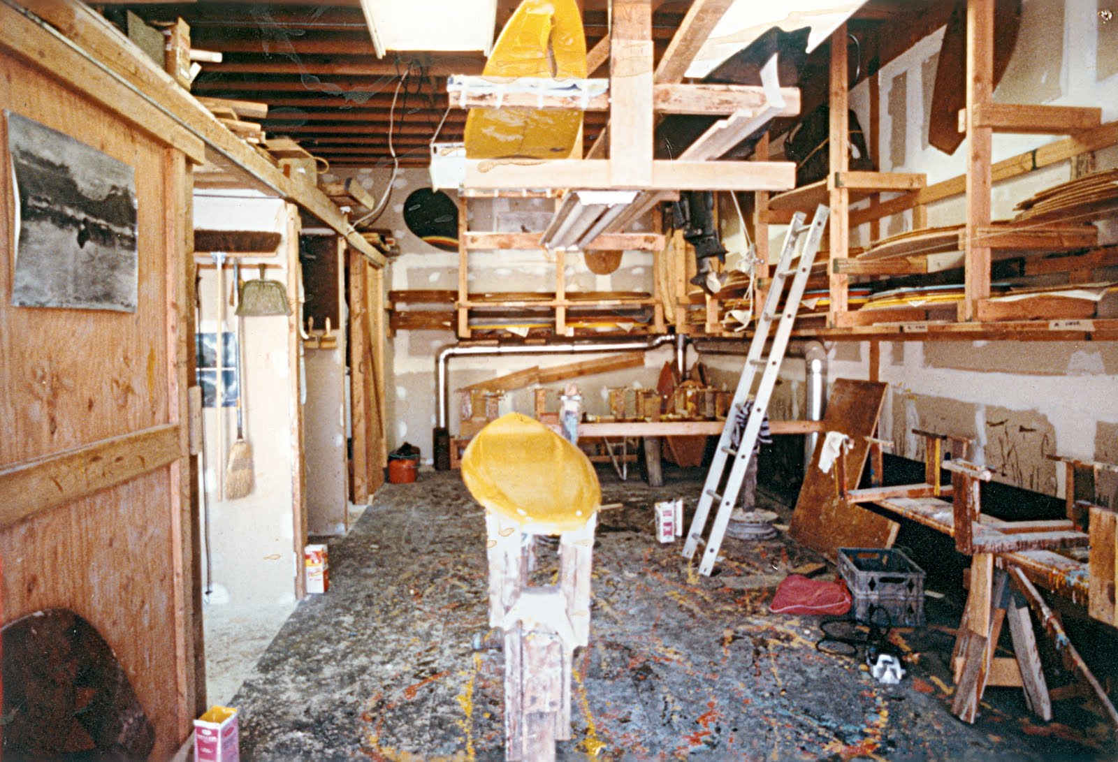 A photo is a time capsule. The first official Victoria shop about 1980, the year we began making our first foam core boards. None are visible in this photo, so it is probably pre 1980. Rent is extremely expensive in Laguna, so the shop is a study in maximizing space. The Tour: (clockwise from 9 pm.) Sliding door to shaping room with brooms etc. Middle slot with brushes on wall is the resin storage bay. Furthest back is sliding door to the office/showroom, a spacious 8′ x 9′ space. Main room, old Rainmaker skimboard on back wall, glassed while at Lewis and Clark College in Portland Oregon in 1971. Finished boards storage all around wall on hanging racks, ventilation ducting (a huge expense for us), back wall a mysto wood warper, at the time our best invention. Outboard motor hanging from ceiling by ladder for voyages in the Makana, “The Gift”, my grandfathers 14′ outboard motorboat circa 1950, modified by David Kahanamoku and myself to have a cabin, and reinforced deck and stringers, for wild forays to the Hollister Ranch for surfing nirvana. Oh! the stories I could tell. Overhead surfboard storage racks, David Kahanamoku shaped yellow surfboard in final glassing stages is below. Resin/tarpaper covered floor, usually the racks to the right, on sawhorses were pulled into the room for glassing 20 skimboards at a time, Note the milk cartons for mixing resins. We still recycle everything we can at Vic and many of the wood structures in the shop are still in use today, though they are incorporated into completely different forms. I gave up that ladder only this year when we sold our house, as it was more useful to the new owner, than to me. Co-founder, Peter Prietto was probably still my business partner. The back door out of the office gave us great fresh air. In 1982, when our landlord, George Burkhardt built a new complex just around the bend, we moved there and expanded into two units. Now we are up to 5 units here and a separate glassing facility down in San Clemente. Click on picture to make it larger. Tex Haines