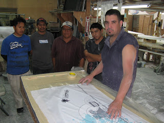 Spotlight on Antonio Martin on the right. He does all the jobs, and manages all the guys doing all the jobs. He can run a computer cutting machine, and shape, vacuum bag, glass Woody’s, mix any kind of resins, run a press, and lay a new patio for you or build a wall. And you can add to that another 99 specialty jobs he as mastered. He is the manager for our plant in San Clemente and without him we would all be working elsewhere. He has given one digit of his left index finger, for the company, because of a nasty skill saw accident. Not to mention the ulcers he has suffered from being the center of employee disputes over the years. “Hard working” barely describes this guy. He will bear hug a drum of resin at 500 lbs and move it around the floor like a dancer. He is constantly guilty of trying to too much at once, leading by example, constantly showing the others how to get it done by not wasting any time. Longevity is one key to Victoria Skimboards’ success and our relationship with Antonio is one of the many benefits that our customers probably don’t appreciate. Your valuable dollars are not wasted on a Vic skimboard when you have someone like Antonio working for you. Thank you Antonio, from all of us.
